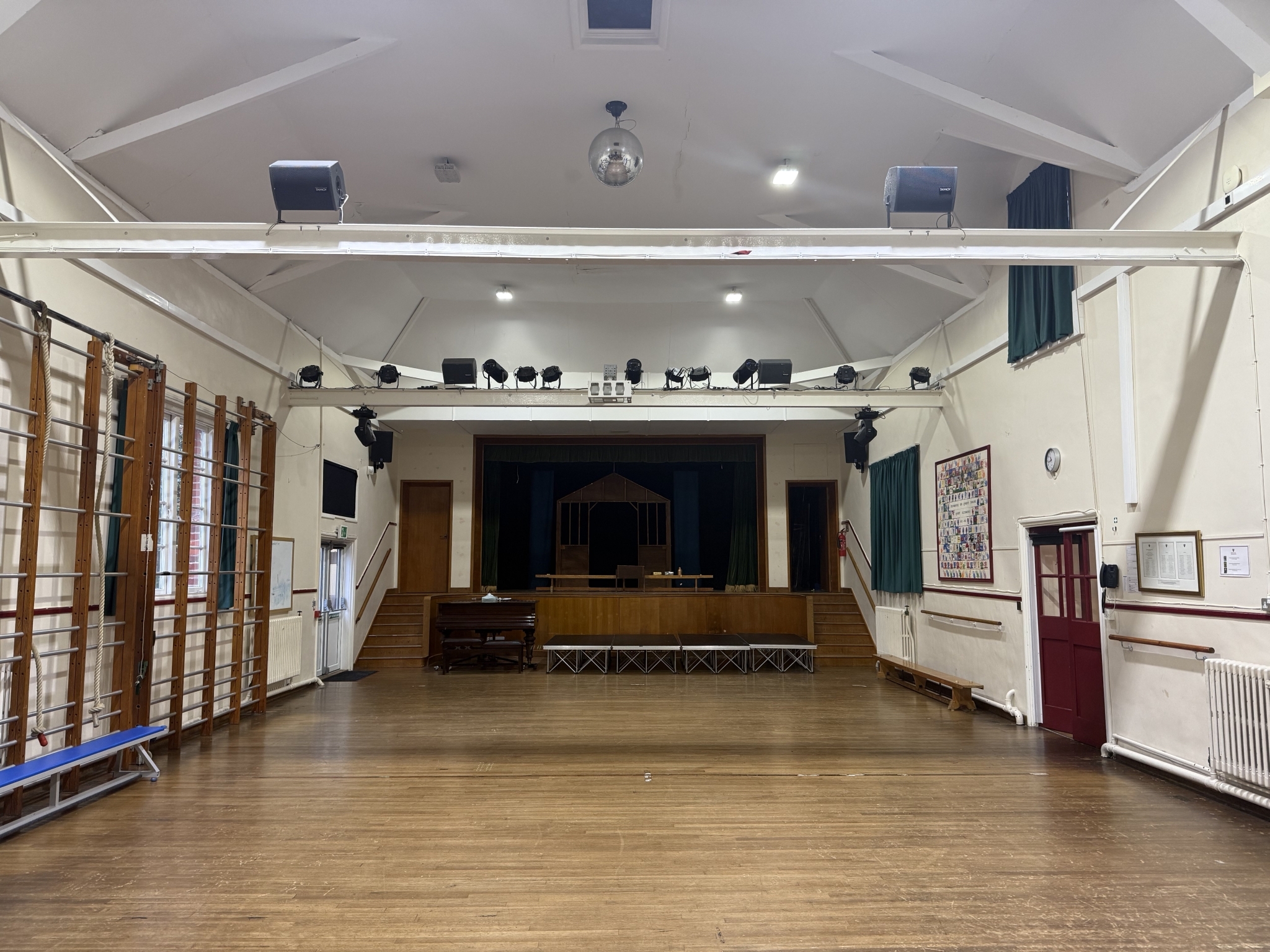 An indoor space suitable for soft ball activities and a variety of sports. Features retractable climbing frames for gymnastics.